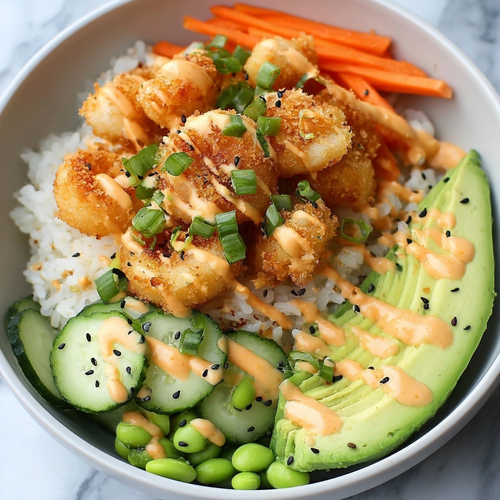 This Bang Bang Shrimp Rice Bowl is a flavorful and satisfying dish featuring crispy fried shrimp coated in a spicy-sweet Bang Bang sauce, served atop a bed of fluffy rice with fresh vegetables like avocado, edamame, carrot, and cucumber. Perfect for a delicious and colorful meal that combines crunchy textures with creamy, tangy, and zesty flavors.