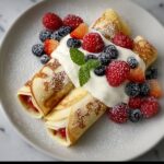 A delightful recipe for Fruit-Filled Cannoli featuring crispy homemade shells filled with a creamy ricotta and mascarpone mixture, topped with fresh mixed fruits and garnished with powdered sugar and mint leaves. Perfect for a refreshing and elegant dessert.