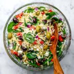 - Prepare the Salad Base: Transfer the cooled orzo into a large mixing bowl. Add the torn baby spinach leaves, chopped red bell pepper, diced cucumber, diced red onion, and both types of olives. Crumble half of the feta cheese over the salad mixture for an even distribution of flavor.