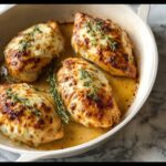 Pop the dish in the oven uncovered and bake for 25 to 30 minutes. The chicken is ready when it registers 165°F (74°C) inside and the topping is bubbly and golden. The baking time ensures the chicken stays moist and tender, true to the Melt in Mouth Chicken Recipe’s promise.