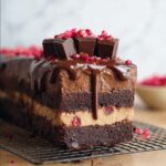 Once the brownie base has set, gently spread the vegan ganache over the top using an offset spatula or butter knife for smooth, even coverage. Sprinkle with toasted hazelnuts and freeze-dried raspberries for texture and an irresistible pop of color. These toppings bring both crunch and a fresh brightness that make each piece feel special.