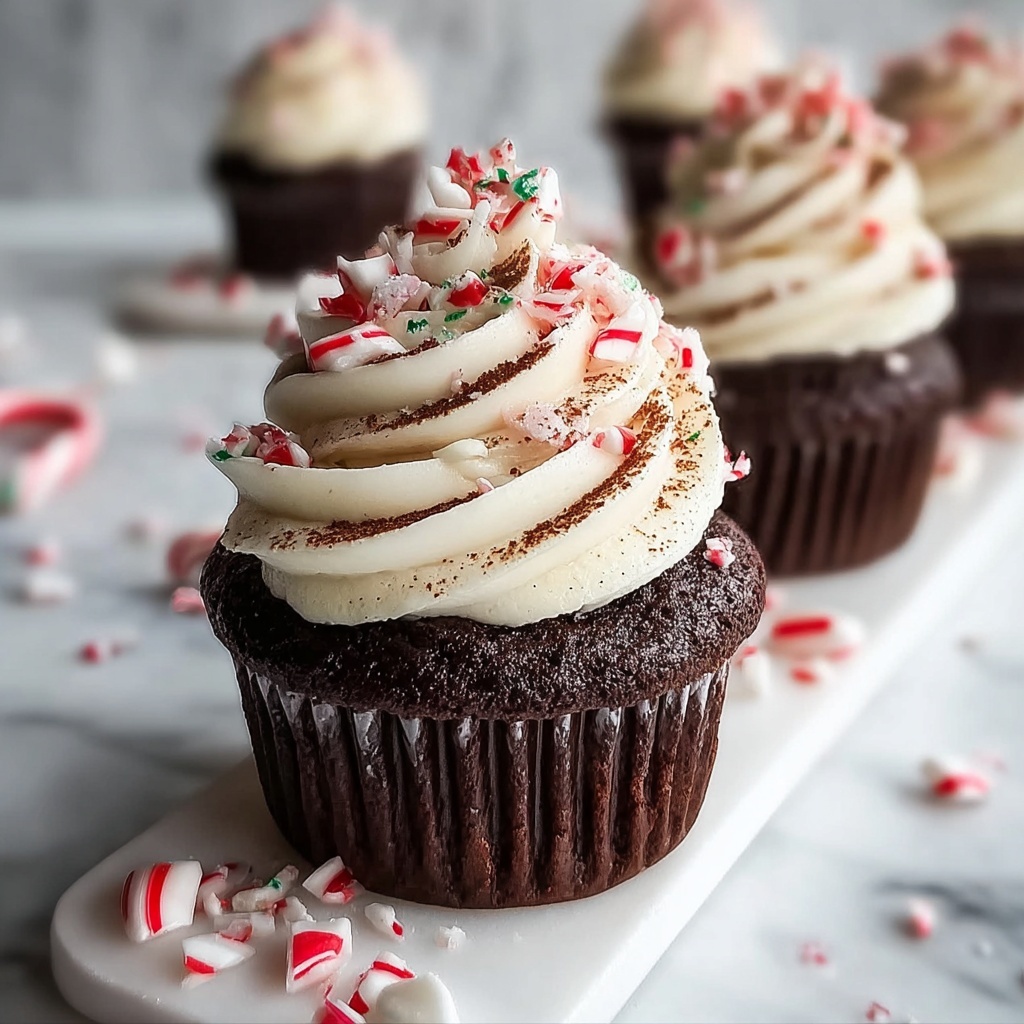 Celebrate the holiday season with these delightful Peppermint Mocha Cupcakes, featuring a rich chocolate coffee-flavored cake infused with peppermint extract and topped with a creamy mocha buttercream frosting garnished with festive crushed candy canes and chocolate shavings.