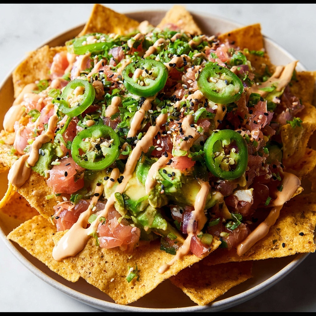 Adding garnishes such as thinly sliced jalapeños or a squeeze of fresh lime juice brings additional layers of freshness and spice that elevate your poke nachos from tasty to unforgettable. Sprinkle with finely chopped chives or a dusting of crushed seaweed flakes for a trendy, ocean-inspired touch.