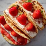 Delight in these Strawberry Cheesecake Tacos, a unique and indulgent dessert featuring crispy cinnamon-sugar fried tortilla shells filled with smooth, creamy cheesecake and a fresh, sweet strawberry topping. Perfect for a fun twist on traditional cheesecake, these handheld treats combine the crunch of fried tortillas with the lusciousness of whipped cream and cream cheese filling, balanced by juicy strawberries and a hint of strawberry jam.