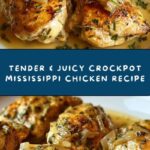 This Tender & Juicy Crockpot Mississippi Chicken recipe is a simple and flavorful slow-cooked chicken dish featuring boneless, skinless chicken breasts simmered with au jus gravy mix, ranch dressing mix, butter, and tangy pepperoncini peppers. The chicken becomes effortlessly tender and juicy, perfect for shredding and serving over rice, in sandwiches, or tacos, making it an easy and crowd-pleasing meal.